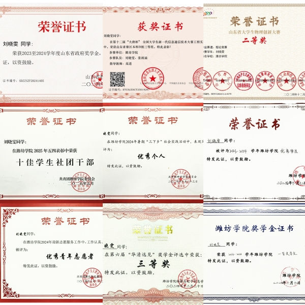 曾获山东省政府奖学金、第十六届蓝桥杯全国软件和信息技术专业人才大赛山东赛区 5G 全网规划与设计二等奖、第十二届 “大唐杯” 全国大学生新一代信息通信技术大赛工程实践赛三等奖、潍坊学院一等奖学金、潍坊学院优秀学生、文明停车志愿服务优秀个人、潍坊学院志愿者、十佳学生社团干部、“三下乡” 优秀个人、第五届 “词达人杯” 校赛一等奖等国家级1项、省级7项、校级及其他荣誉10余项。