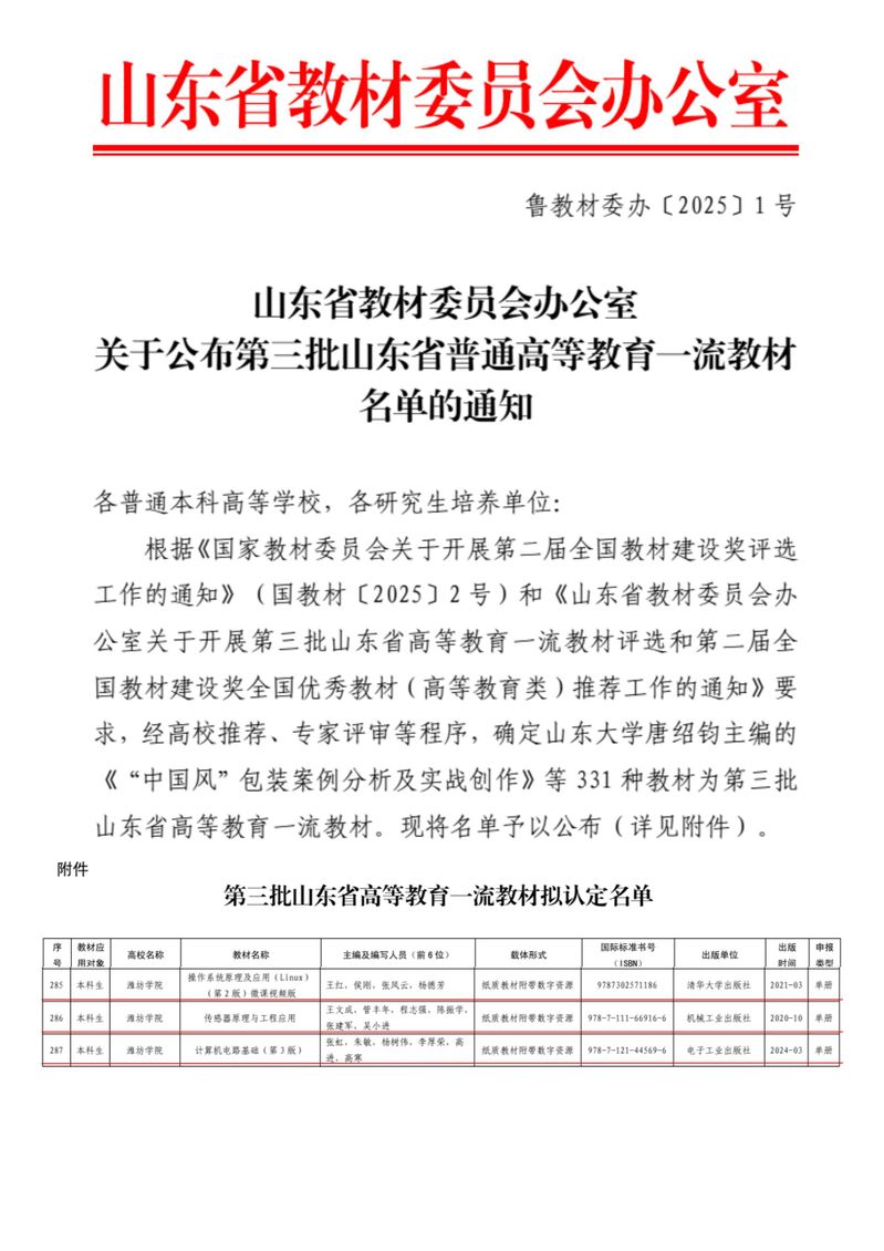 近日,山东省教育厅正式公布第三批山东省普通高等教育一流教材名单,由我院张虹教授主编,电子工业出版社出版的教材《计算机电路基础(第三版)》成功入选。