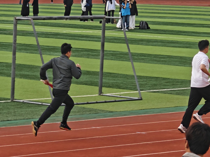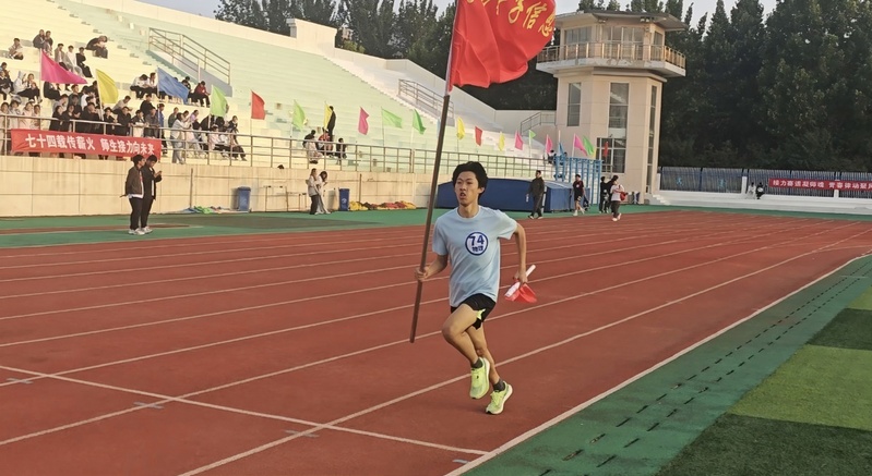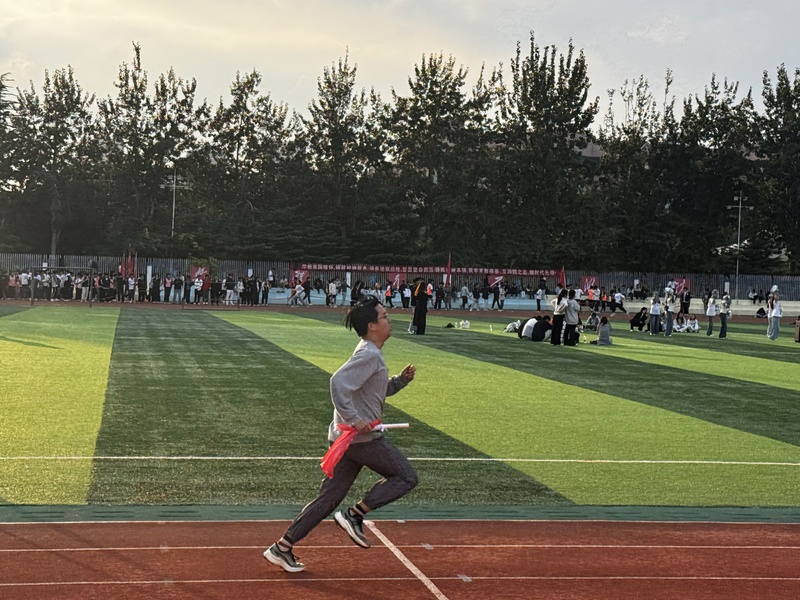 赛场上,物电学院队员们全程全力以赴。各棒次队员衔接流畅,从教师首棒的稳健起步,到学生棒次的加速追赶,每一次接力棒传递都精准高效。进入最后一棒赛程时,物电学院队员扛着院旗冲出接力区,红色院旗在赛道上迎风展开,“物电加油”的呐喊瞬间声贯穿赛道,在全场助威声中,队员扛旗稳步冲过终点线。