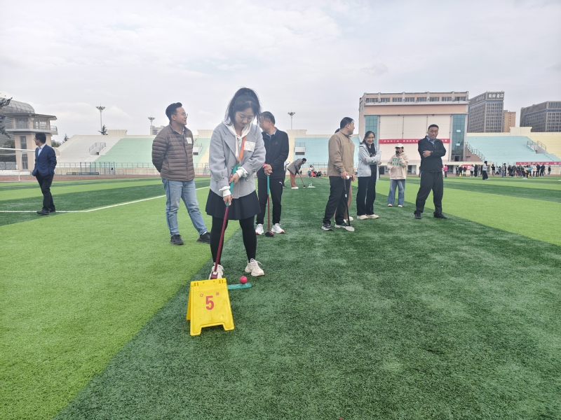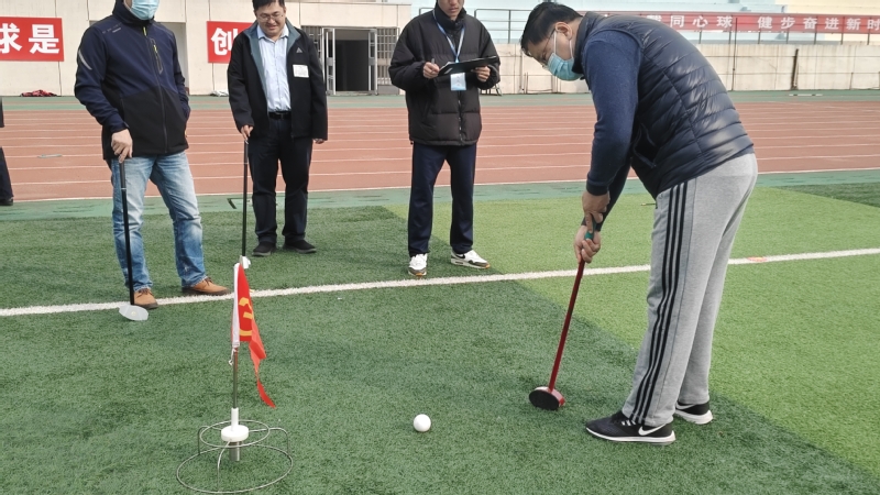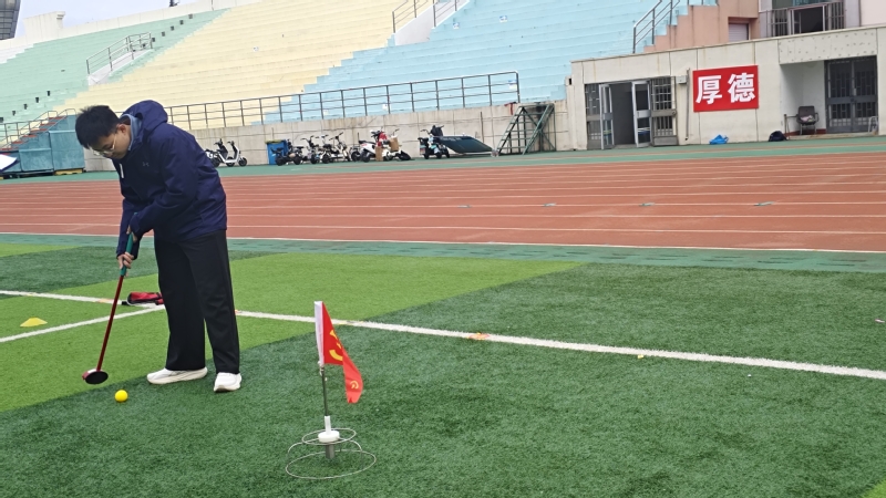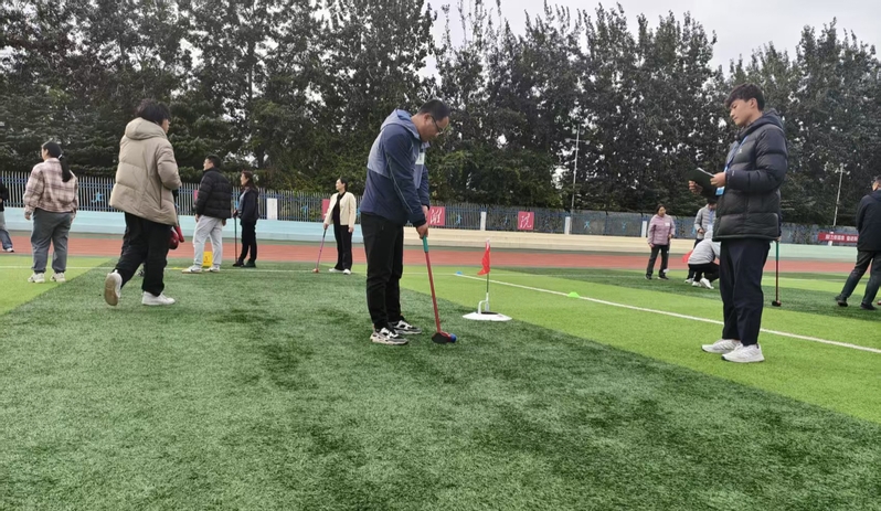 比赛现场氛围热烈,各学院代表队同台竞技。我院党委副书记、副院长于尔河担任领队,队员高娟娟、陈安涛、张国廷和于龙共同出战。赛场上,于尔河眼神专注,推杆动作流畅稳健,多次打出高质量击球;其他队员也各展所长,或精准控制力度,或巧妙调整角度,凭借扎实的技术,精准完成每一次击球。一次次成功的击球引得赛场氛围愈发热烈,充分展现了物电教职工的活力与风采。