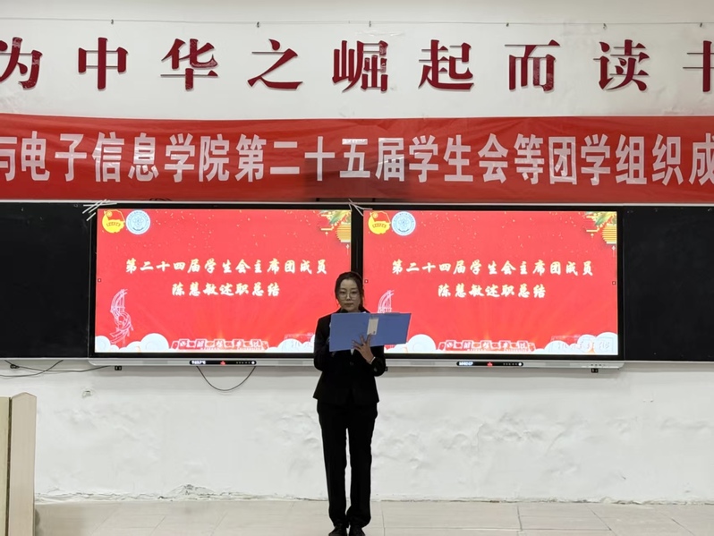 大会在庄严的国歌声中拉开帷幕。第24届学生会主席团成员陈慧敏作述职报告,全面回顾过往工作成效;第25届团学组织团委副书记(学生)健子龙宣读新一届成员名单,第25届学生会执行主席刘源就职发言,新成员代表李博帆发言,李玉婧为第25届学生会等团学组织主席团成员颁发聘书,第25届团学组织大学生自律中心主任严若瑄宣读《学生干部自律公约》,第25届学生会主席团成员李晓彤带领宣誓,凝聚起全体成员为组织发展贡献力量的坚定信念。