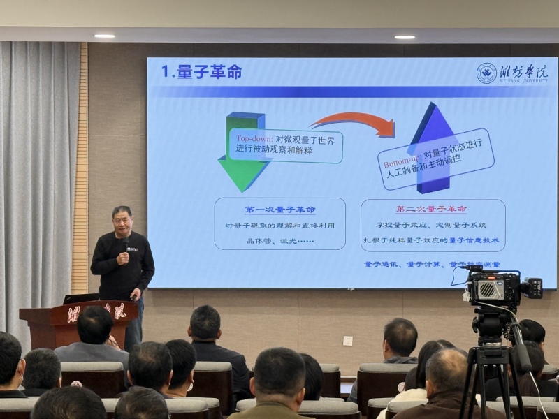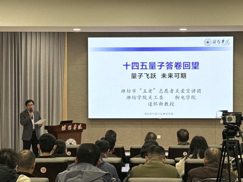 为全方位、系统性地复盘“十四五”规划实施期间,我国在量子科技领域理论研究、技术攻关、产业应用等多方面的丰硕成果与重大突破,深入总结行业发展宝贵经验,11月13日下午,我院携手校关心下一代工作委员会、潍坊市“五老”志愿者关爱宣讲团,于知新楼4210室共同举办了“‘十四五’量子答卷回望”主题报告会。本次报告会由物理与电子信息学院党委副书记、院长曹连振主持,特邀学院原院长逯怀新教授作主题报告。离退休工作处处长戴建民、副处长代宝刚以及物电学院师生代表参会。
