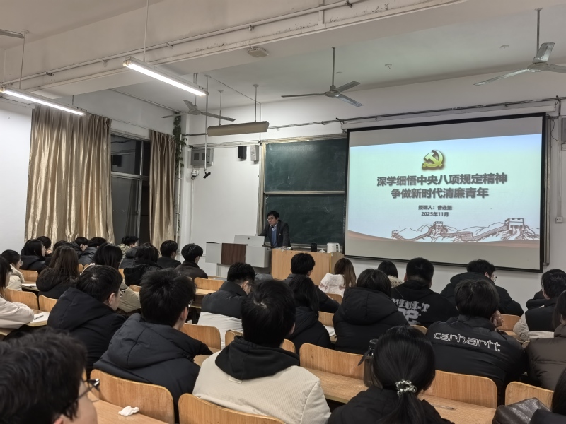 曹连振以《深学细悟中央八项规定精神 争做新时代清廉青年》为题,围绕中央八项规定精神中清廉建设的核心要义,从其产生的时代背景、相关核心内容及对青年成长的深远意义展开系统讲授。曹连振强调,新时代青年大学生作为国家未来的栋梁,需深刻领会中央八项规定精神中蕴含的清廉内核与价值追求,真正做到内化于心、外化于行。要自觉发挥先锋模范作用,带头严守自律准则,坚决抵制享乐主义、奢靡之风等不良风气,以实际行动涵养清廉品格,争做忠诚干净、担当有为的新时代清廉青年。