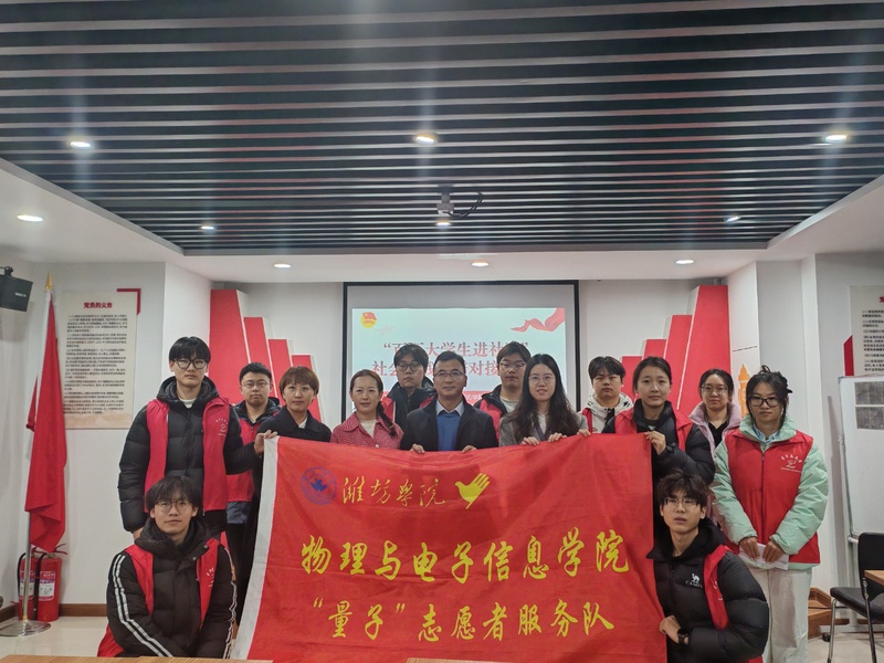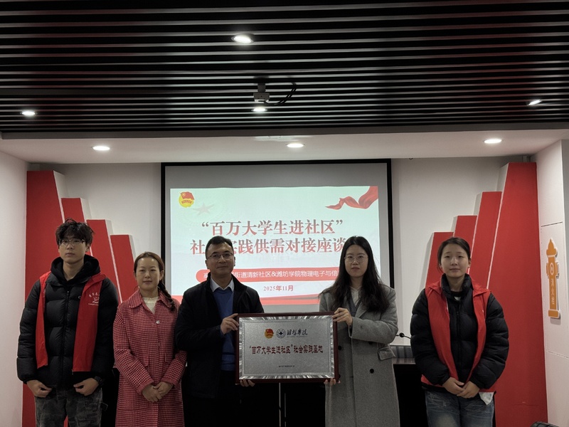为深化校社协同育人机制,充分发挥青年学子服务基层的先锋作用,2025年11月27日,潍坊学院物理与电子信息学院与潍坊市高新区新城街道清新社区联合举办“百万大学生进社区”社会实践供需对接座谈会。清新社区党支部书记马鸿、党支部副书记冯燕及社区相关负责人,物电学院团委负责人李玉婧、“量子”志愿者服务队学生代表参会。