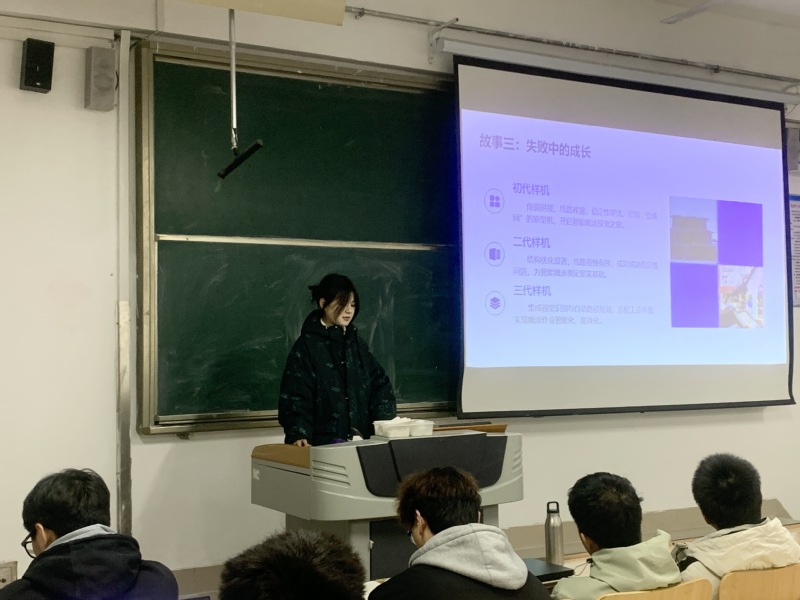 李鑫蕾结合其主创的“以乐为桥,以爱践行”音乐疗愈项目,分享了项目从构思、实施到最终荣获省级银奖的全过程,激励同学们积极参与各类科创比赛,在实践中锻炼创新能力、增强综合素养。孙雨桐以其参赛项目“精益求精——半导体洁净厂房智能化喷涂领域开拓者”为案例,生动讲述了扎根一线发现问题、跨专业组队突破壁垒、在试错中迭代优化、依靠团队协作攻坚克难的科创经历,并分享了实用的参赛指南。