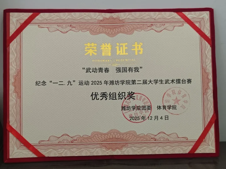 为纪念一二·九运动,致敬先辈爱国情怀,传承中华武术文化,丰富校园文体生活,2025年12月4日,潍坊学院第二届武术擂台赛在学校田径场圆满落幕。我院学子凭借规范的动作、饱满的状态与出色的表现,斩获学校一等奖和优秀组织奖,为学院赢得荣誉!