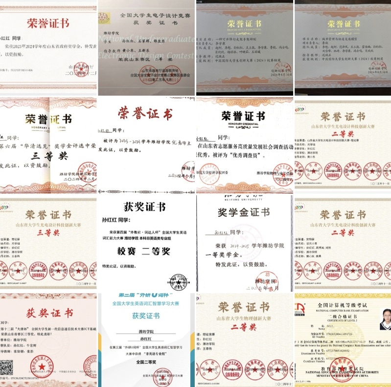在竞赛实践领域,她斩获多项重量级奖项:山东省政府奖学金、全国电子设计大赛山东省赛区二等奖、第十二届大唐杯全国大学生新一代信息通信技术大赛山东省赛区三等奖、山东省光电设计科技创新大赛实物赛二等奖、山东省物理创新大赛理论赛二等奖等。