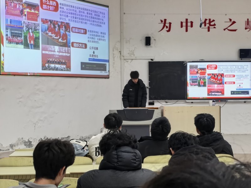 为深入宣传大学生志愿服务西部计划,引导青年学生将个人发展融入国家发展大局,2025年12月,物电学院于5109教室举办“就业引航·逐梦西部”西部计划专题宣讲会,学院各年级学生踊跃参与。