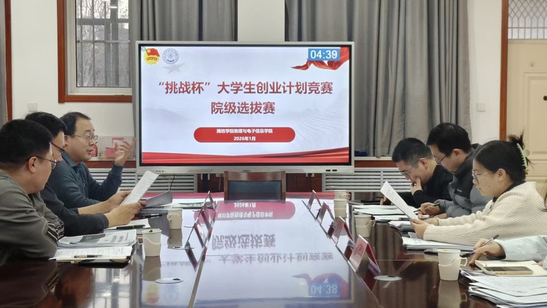 为激发大学生创新精神与创业热情,锤炼实践能力、夯实双创基础,2026年1月7日下午,物电学院在明正楼5205会议室举办第十五届“挑战杯”大学生创业计划竞赛院级选拔赛,学院副院长韩锴、孙兵,各参赛队伍指导老师及学生代表参加。