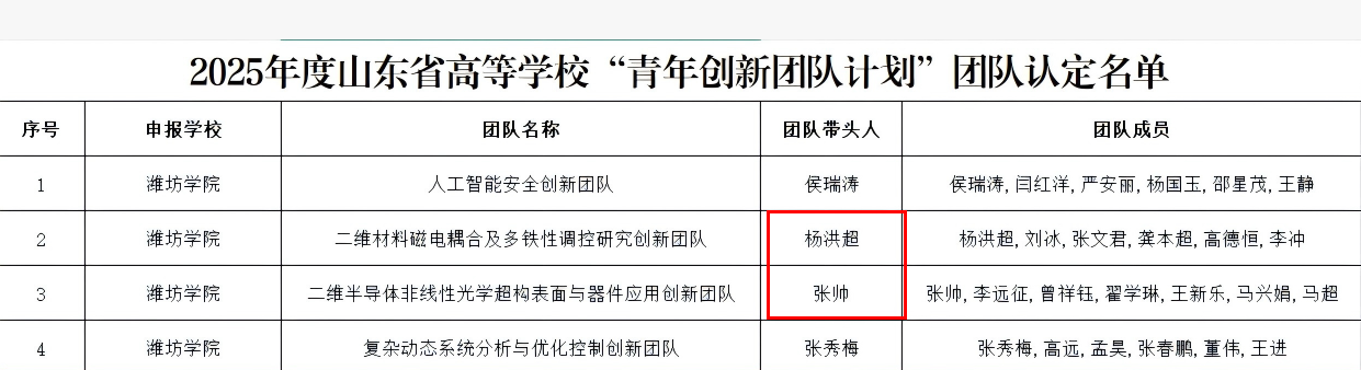 近日,山东省教育厅公布2025年度山东省高等学校“青年创新团队计划”立项名单,我院杨洪超博士牵头的“二维材料磁电耦合及多铁性调控研究创新团队”与张帅博士牵头的“二维半导体非线性光学超构表面与器件应用创新团队”双双入选,标志着我院在低维材料与光电信息领域的青年科研力量迈入新的发展阶段。
