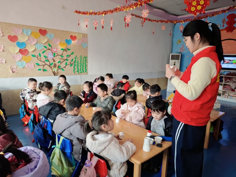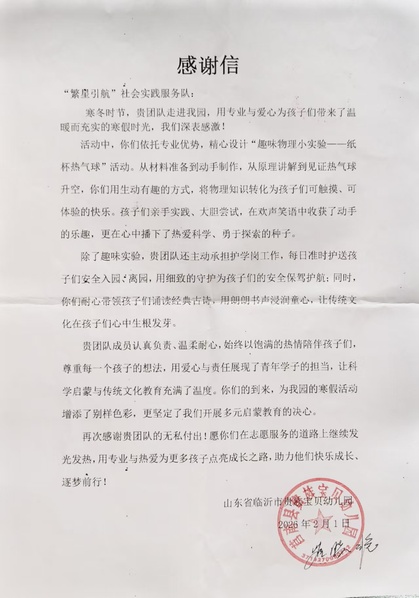 为让乡村幼儿近距离感受科学的魅力,在趣味实验中开启科学探索,2026年2月1日,物电学院“繁星引航”社会实践服务队走进山东省临沂市贵族宝贝幼儿园,以“纸杯升空”为主题,为孩子们带来了一堂生动有趣的科学启蒙课。