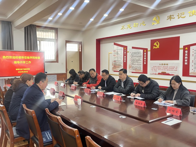 3月9日上午,学校党委委员、宣传部部长张晓静率队到物电学院检查指导开学指导工作,安全保卫处处长翟立波、资产管理处副处长单既新陪同检查指导,学院领导班子成员、助理、两办主任等全程参与。