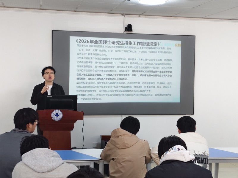 为助力我院学子顺利应对考研复试与调剂环节,精准把握备考方向,提升应试竞争力,2026年3月26日,物电学院承办的“职约周四”就业赋能系列活动之研途护航·考研复试调剂精准指导会,在大学生创业孵化基地210室顺利举办。本次活动邀请博文老师开展“考研复试调剂突击提升方法论指导”专题讲座,物电学院部分考研学子到场聆听学习。
