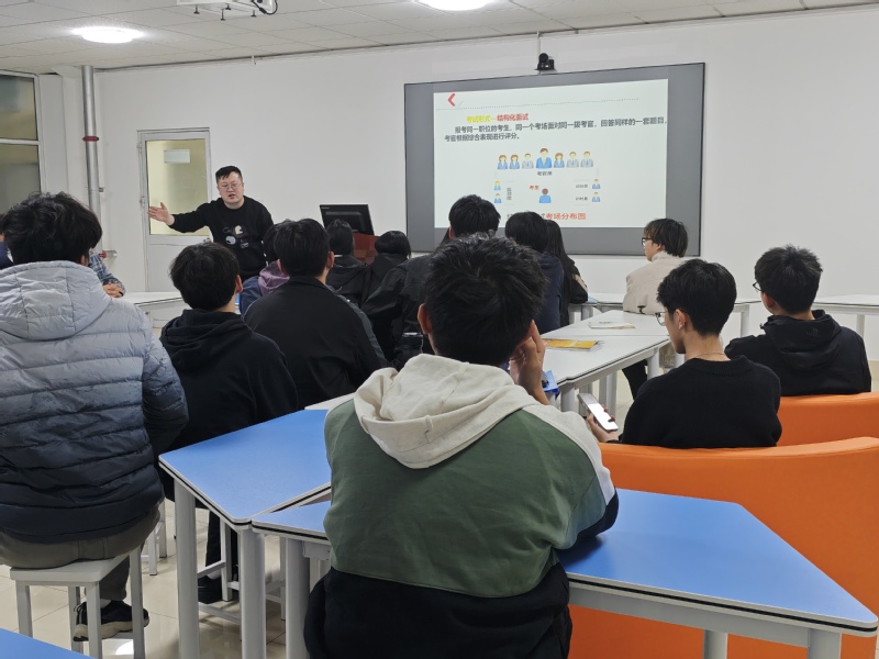 活动中,刘老师结合职场招聘实际,系统讲解了结构化、半结构化、无领导小组讨论等主流面试形式,拆解各类型面试的考核重点、应答技巧与评分逻辑。现场还设置实战模拟环节,学生分组进行面试演练,老师针对学生的现场表现,从仪容仪表、语言表达、答题思路、逻辑思维等方面进行精准点评,指出问题并给出可操作的改进建议,让学生直观发现自身不足,掌握实用面试方法。