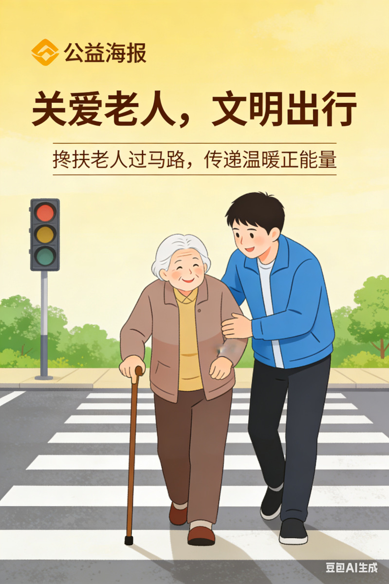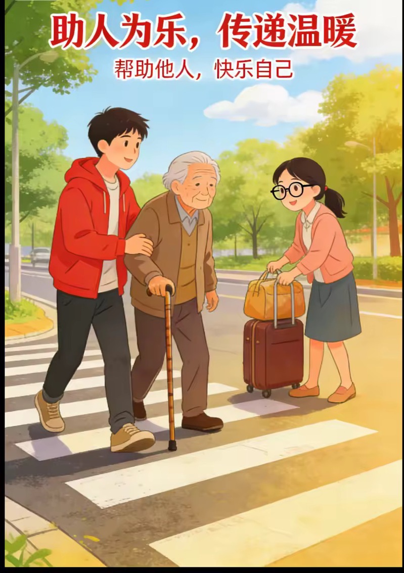 创作背景:作品以城市斑马线为明亮底色,描绘青年学子搀扶拄拐老人过马路的暖心场景,紧握的手臂与平稳的步伐,传递着关爱。创作紧扣雷锋精神中敬老爱老、助人为乐的内核,将青年学子的善意与热忱融入公共生活图景,用数字画笔传递文明温度,彰显新时代青年践行雷锋精神、传递温暖正能量的责任担当。