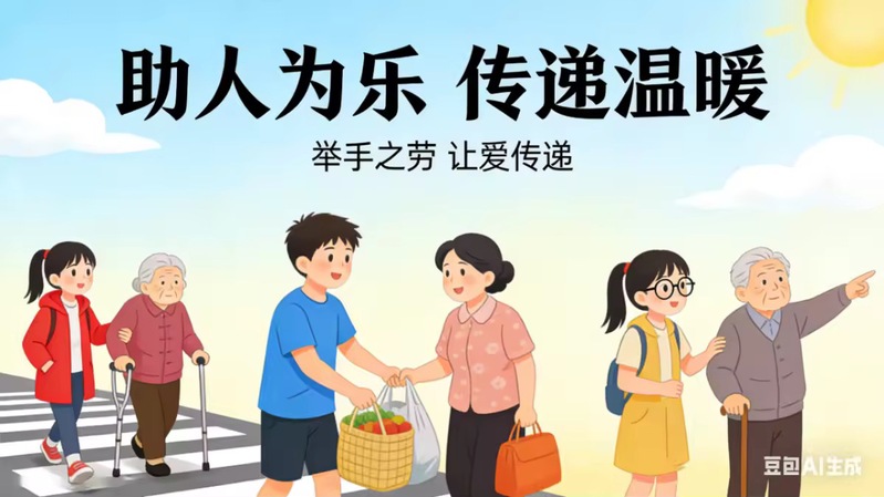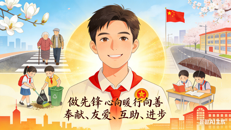 创作背景:作品以春日暖阳为温暖底色,描绘青年学子践行雷锋精神的多元场景,既有搀扶老人过马路的温情瞬间,也有校园清洁、互助学习的青春身影。创作紧扣雷锋精神中奉献、友爱、互助、进步的内核,将青年学子的初心与担当融入时代图景,用数字画笔勾勒出新时代青年心向暖、行向善的青春风采。