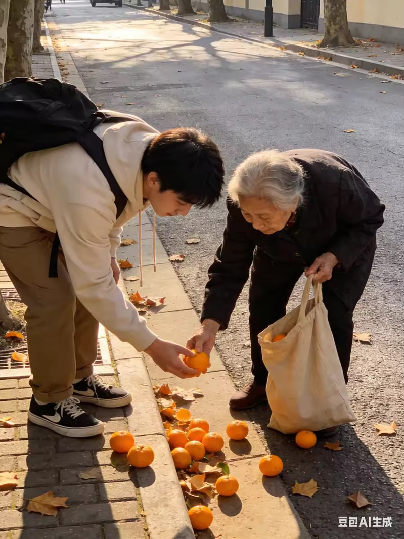 创作背景:作品以秋日暖阳街巷为治愈底色,描绘青年学子弯腰捡拾散落橘子、帮扶老人归置物资的暖心场景,拾起的果实与递出的善意是奉献的生动写照。创作紧扣雷锋精神中细微处行善、平凡中坚守的内核,将青年学子的耐心与热忱融入市井生活图景,用数字画笔传递人间暖意。