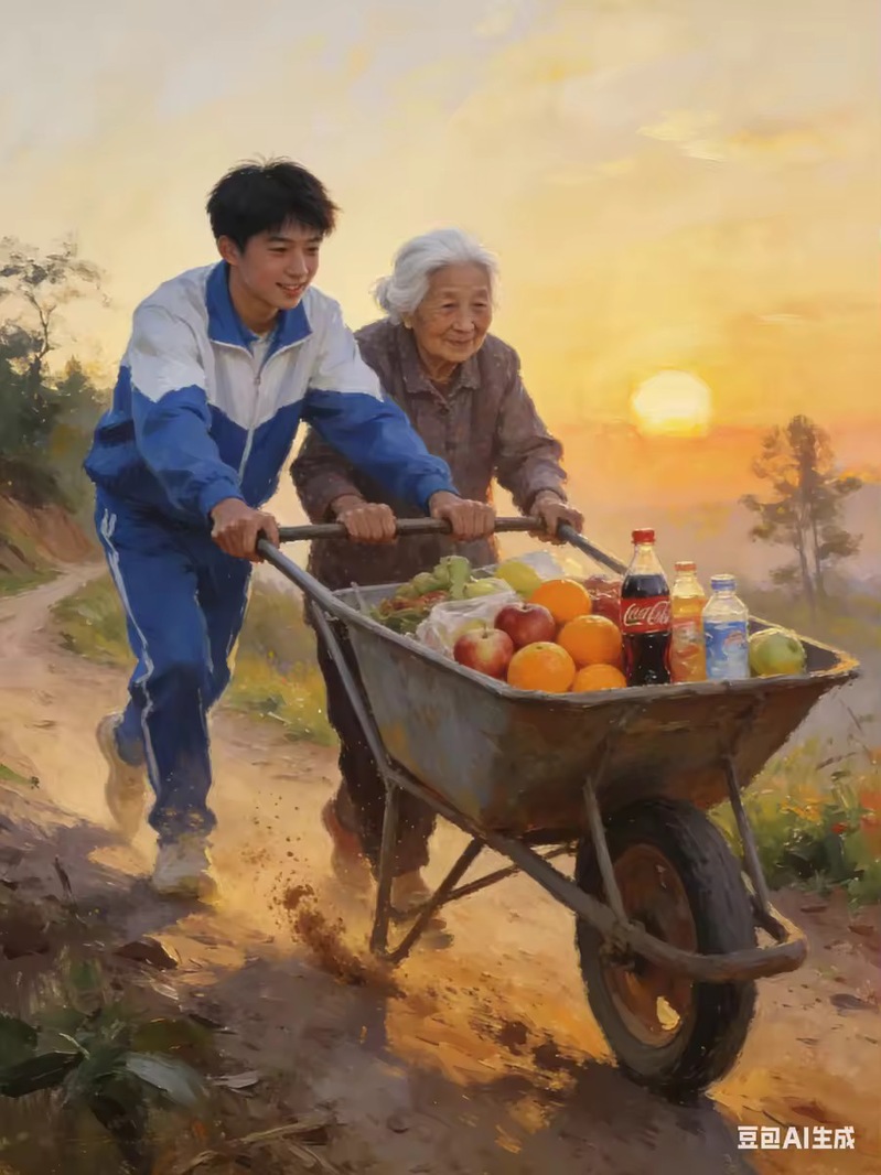 创作背景:作品以乡村夕阳为温暖底色,描绘青年学子与老人并肩合力推车的暖心场景。满载蔬果与生活物资的手推车,是关爱与奉献的生动写照。创作紧扣雷锋精神中敬老助老、扎根基层的内核,将青年学子的责任与担当融入乡野生活图景,用数字画笔勾勒出新时代青年践行雷锋精神、传递人间温情的生动模样。