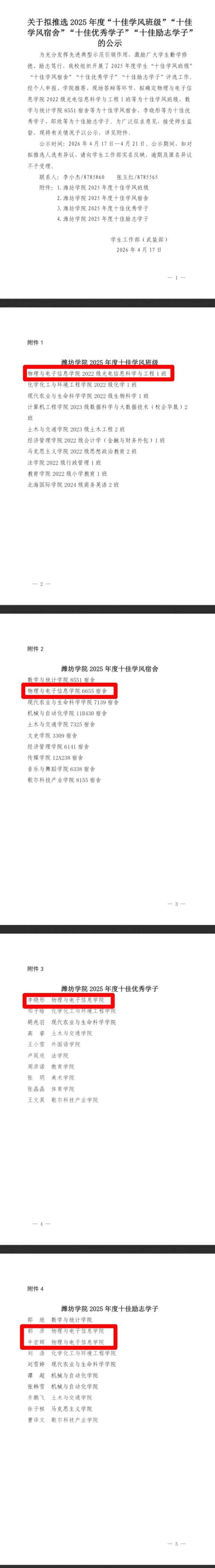 近日,潍坊学院2025 年度 “十佳优秀学子、十佳励志学子、十佳学风班级、十佳学风宿舍” 评选结果正式揭晓。物理与电子信息学院学子与集体凭借过硬实力脱颖而出,一举包揽四项核心荣誉,交出亮眼学风建设答卷。