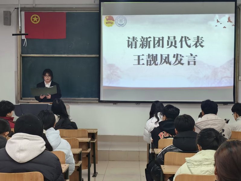 新团员代表王靓凤表达了加入共青团的光荣与喜悦,并承诺将以团员标准严格要求自己:坚定信念、勤学善思、锤炼本领,以实际行动践行“请党放心,强国有我”的青春誓言。
